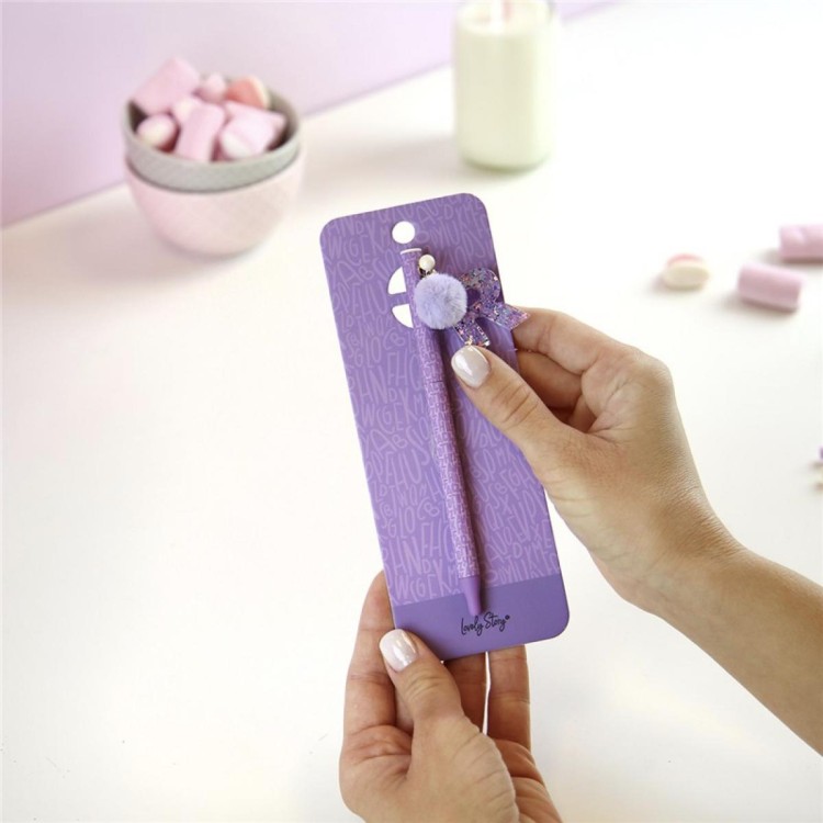 Este bolígrafo lila de Lovely Story incluye un colgante metálico con la letra R y un pompón textil a juego, creando un accesorio de escritura tan práctico como decorativo para el día a día.
