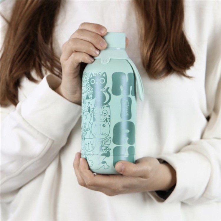 La botella térmica Miau Cats de 500 ml está fabricada en acero inoxidable con doble pared para mantener tus bebidas frías o calientes durante más tiempo. Su diseño de gatos en color mint es ideal para amantes de los animales y del estilo divertido.
