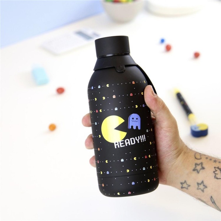 Esta botella térmica de acero inoxidable de 500 ml luce un diseño Retro Pixel en color negro lleno de guiños a los videojuegos clásicos. Es perfecta para llevar agua, café o tu bebida favorita y mantener la temperatura durante horas.