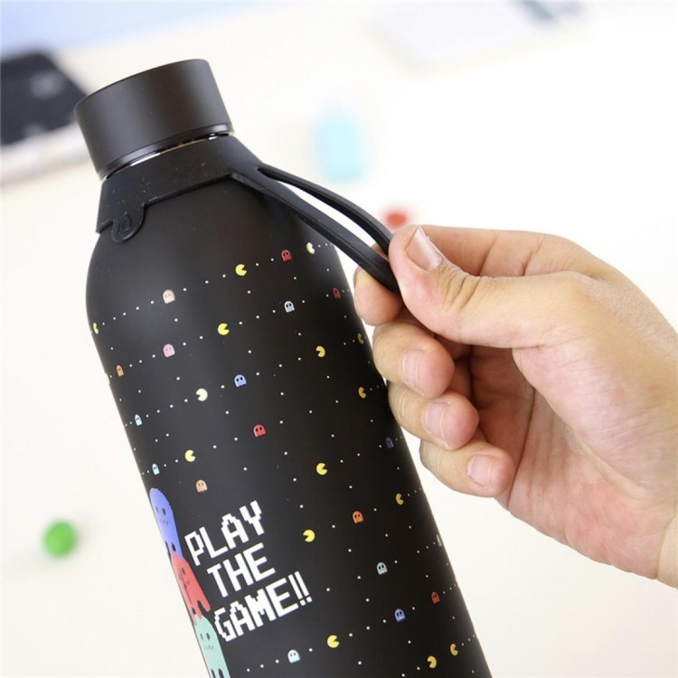 Su tamaño la hace ideal para jornadas largas de estudio, trabajo o deporte y para llevar en mochilas grandes o bolsas de gimnasio. El acabado soft touch en negro con motivos pixelados convierte esta botella en un accesorio imprescindible para gamers.