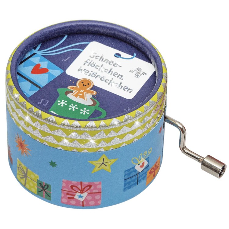 Esta caja de música navideña de Moses funciona con una práctica manivela metálica: al girarla suena una melodía clásica de Navidad que acompaña las ilustraciones de unicornios festivos.