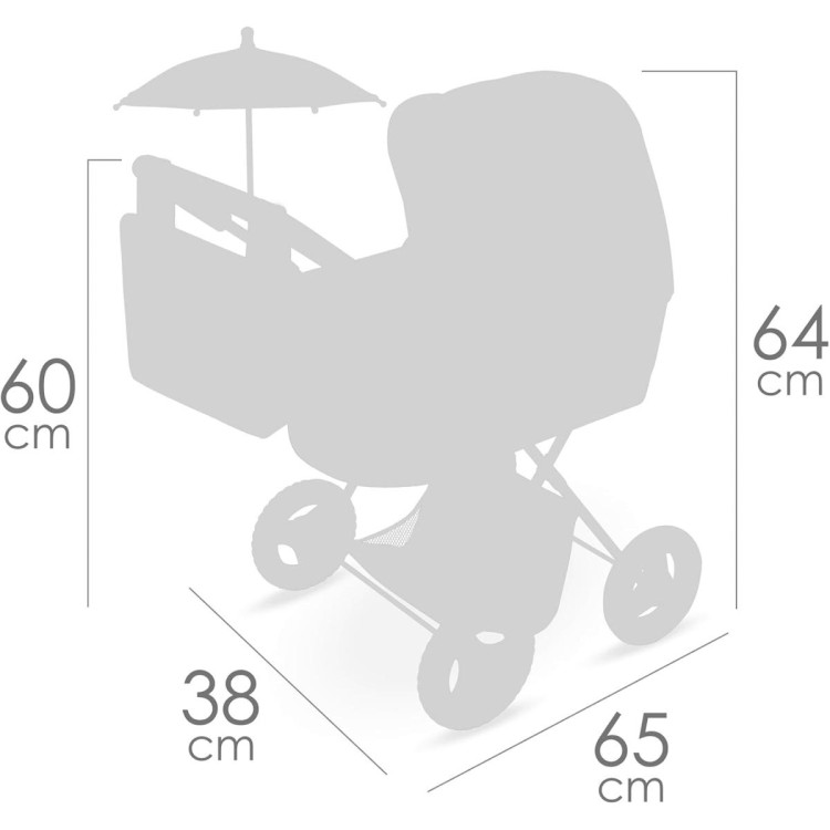 Compatible con muñecas de hasta 48 cm. Ruedas silenciosas y cesta inferior para transportar juguetes. Se pliega para guardar en casa o en el coche.