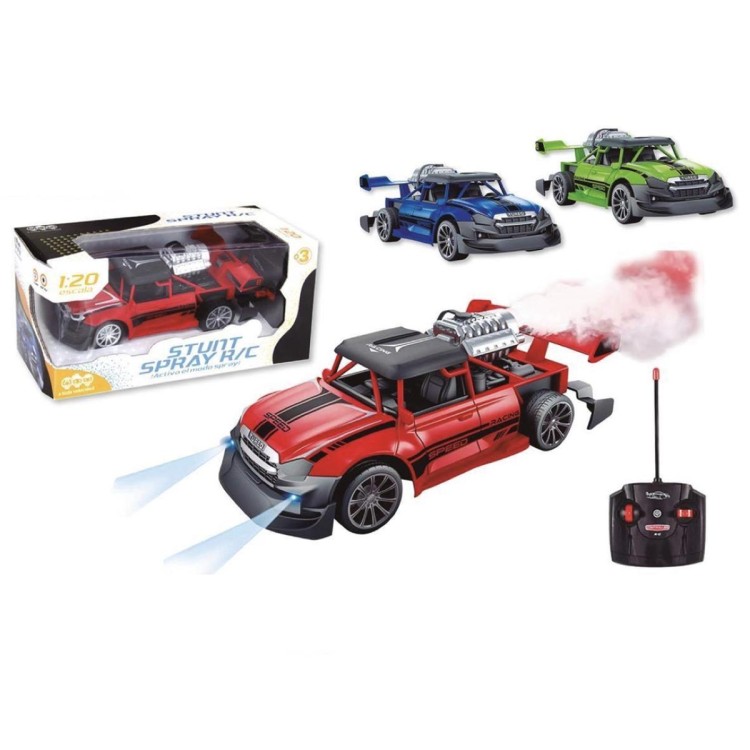 Coche RC Stunt Spray con efecto de humo activable y diseño deportivo para jugar con un toque espectacular. Mando sencillo pensado para girar y avanzar con estabilidad.