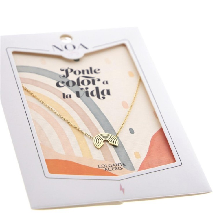 Este colgante de acero dorado incluye un charm con forma de arcoíris sobre una tarjeta con el mensaje Ponle color a la vida, un detalle ideal para personas optimistas y creativas.