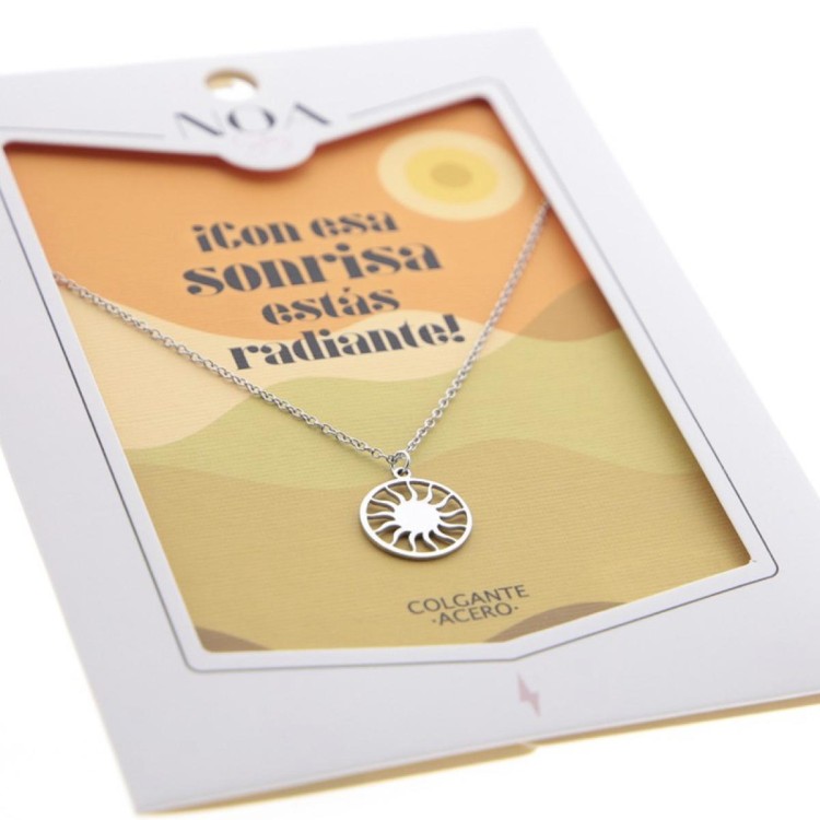 Este colgante de acero plateado destaca por su medalla redonda y su diseño sencillo que combina con todo. La tarjeta en tonos cálidos recoge la frase Con esa sonrisa estás radiante para celebrar a esa persona tan especial.