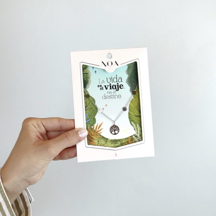 El colgante de acero plateado con árbol de la vida es un símbolo de crecimiento y nuevos comienzos. Sobre la tarjeta tipo selva aparece el mensaje La vida es el viaje no el destino para recordar que cada paso cuenta.