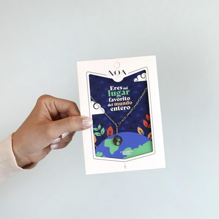 Este colgante largo de acero plateado luce un mundo calado que simboliza viajes, recuerdos y lugares compartidos. La tarjeta colorida acompaña el mensaje Eres mi lugar favorito del mundo entero para decir te quiero de una forma diferente.