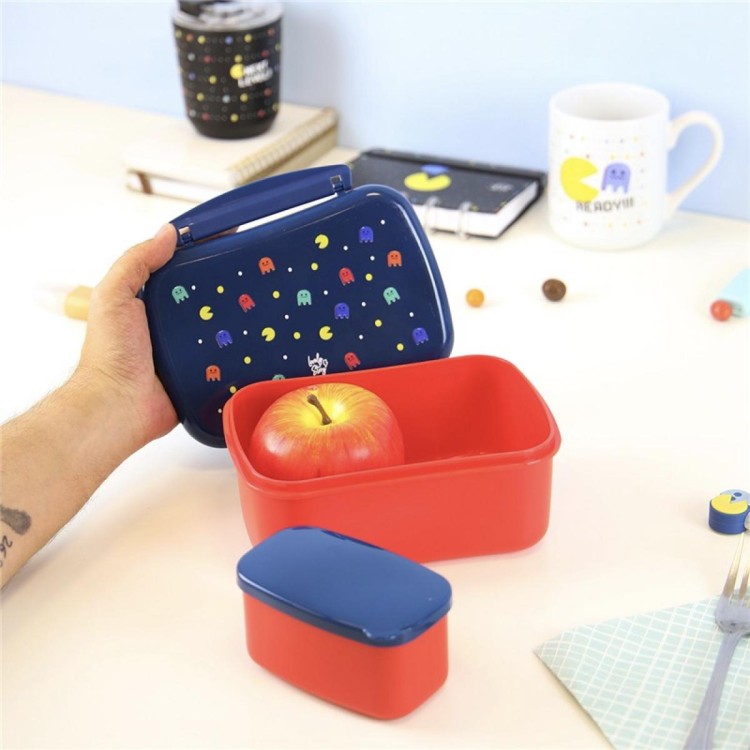 La fiambrera hermética Retro Pixel rojo azul es perfecta para amantes de los videojuegos clásicos, con un diseño inspirado en Pacman y un formato cómodo para transportar comida casera.