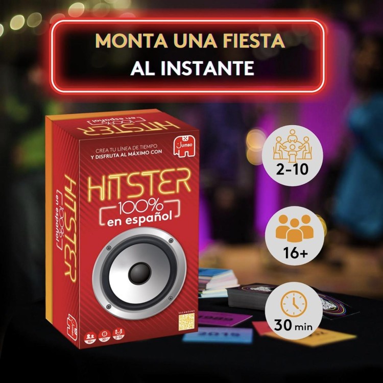 En Hitster escucharás un fragmento musical y deberás colocar la carta en el lugar correcto de tu línea temporal según el año del tema. Incluye cartas con QR para reproducir la canción y diferentes formas de puntuar, lo que lo convierte en un party game ágil y muy competitivo.