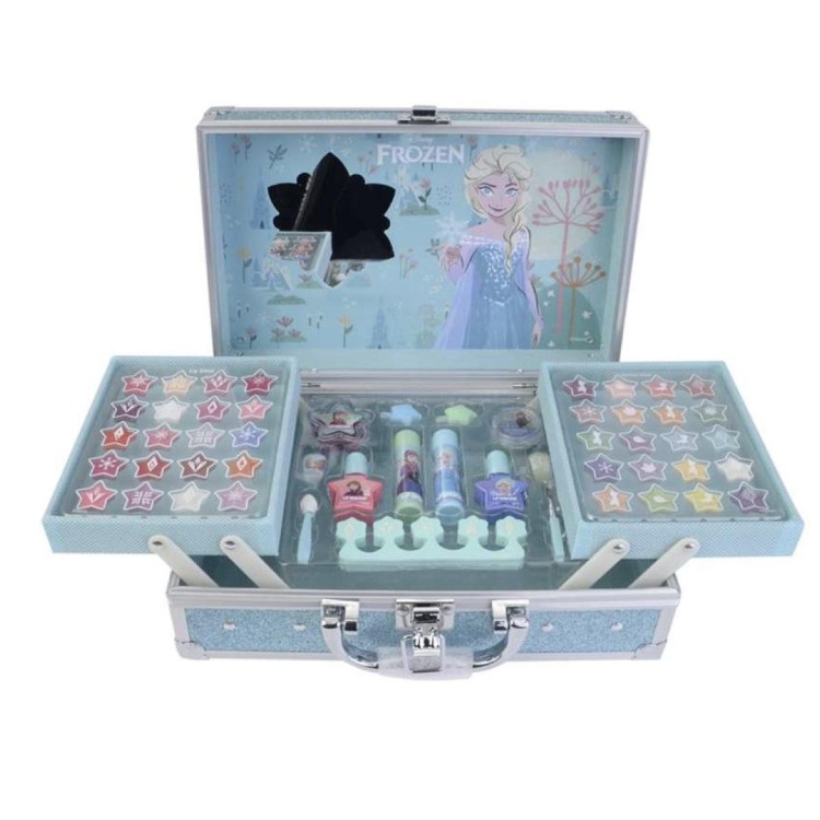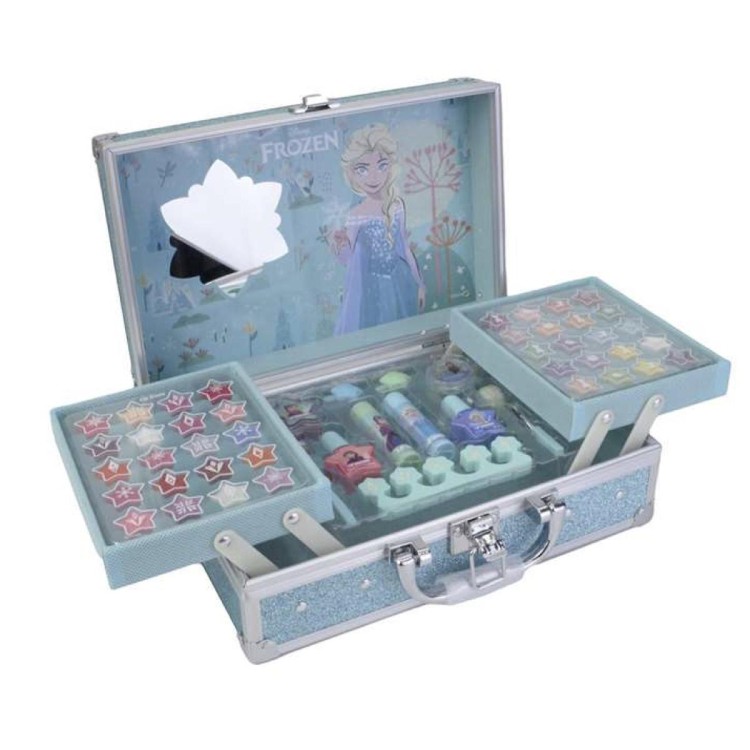 Este maletín metálico Frozen incorpora espejo y dos bandejas abatibles que organizan un amplio surtido de sombras, brillos de labios, esmaltes y accesorios. Un set completo para disfrutar del juego de belleza con la licencia más invernal.