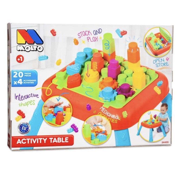 La mesa de actividades Molto incluye 20 piezas entre bloques, engranajes y elementos mecánicos para girar, encajar y apilar. Ideal para que los peques desarrollen la motricidad fina y el juego simbólico.