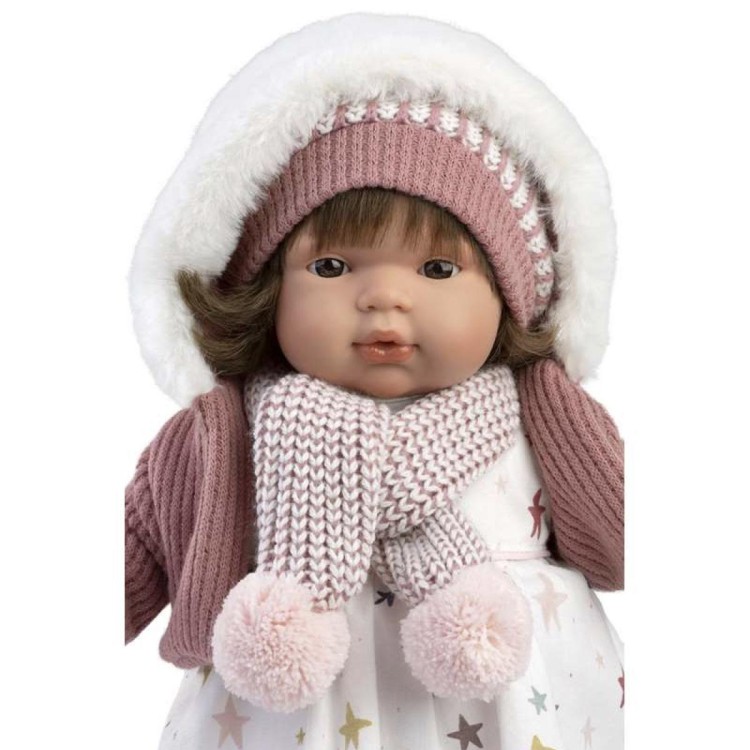 Incluye chupete y conjunto de ropa suave. Tamaño 38 cm, ideal para llevar y jugar en cualquier parte.