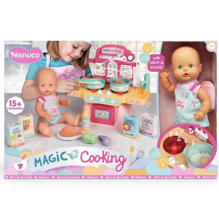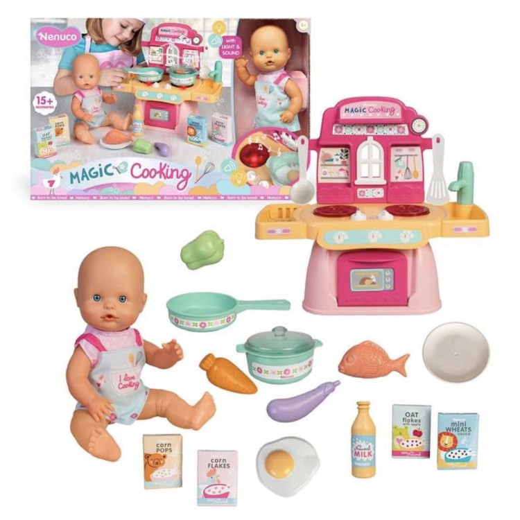 Nenuco Cocinita Mágica combina un muñeco bebé de 30 cm con una cocina infantil para preparar recetas de juego. Los peques pueden simular que cocinan mientras cuidan de su Nenuco.
