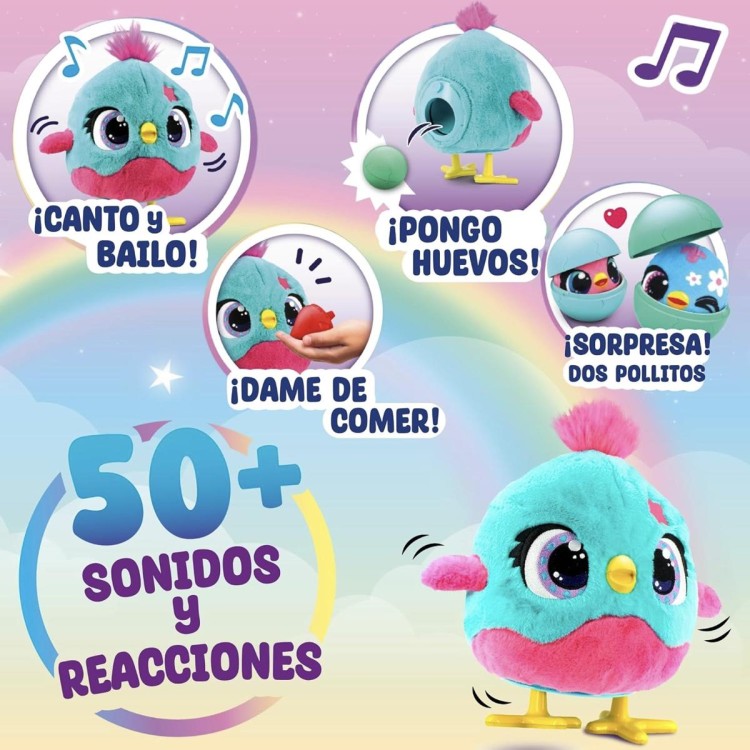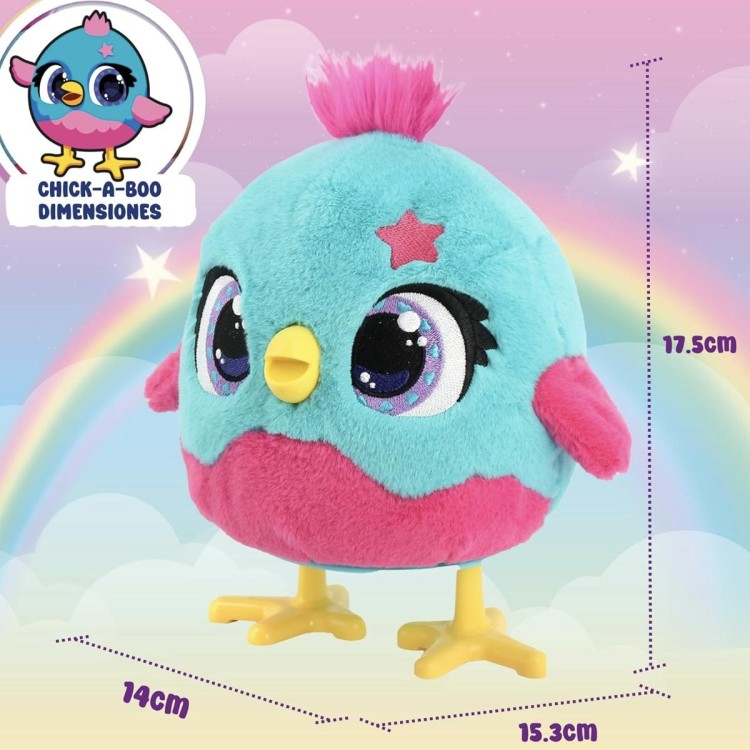 Chick-A-Boo es un peluche interactivo con forma de gallina que invita a jugar a cuidar y mimar a sus huevos sorpresa. Su cuerpo redondeado, los grandes ojos brillantes y los colores vivos captan la atención de los peques desde el primer momento.
