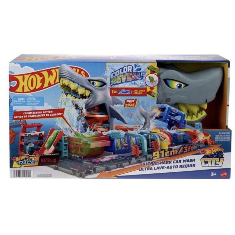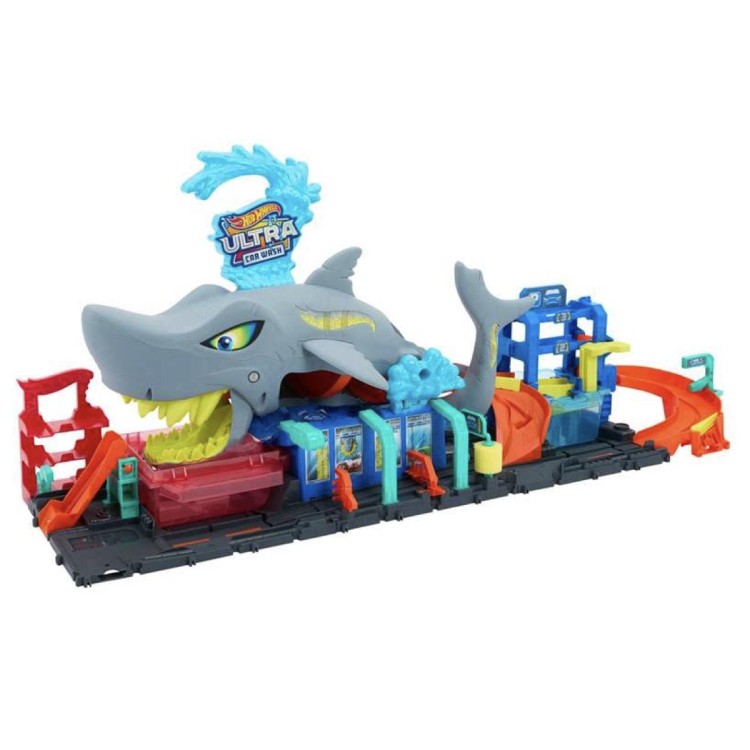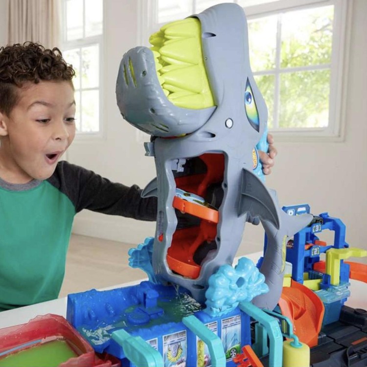 El túnel de lavado con tiburón de Hot Wheels City incluye un coche Color Reveal para experimentar cambios de color con agua fría/caliente.