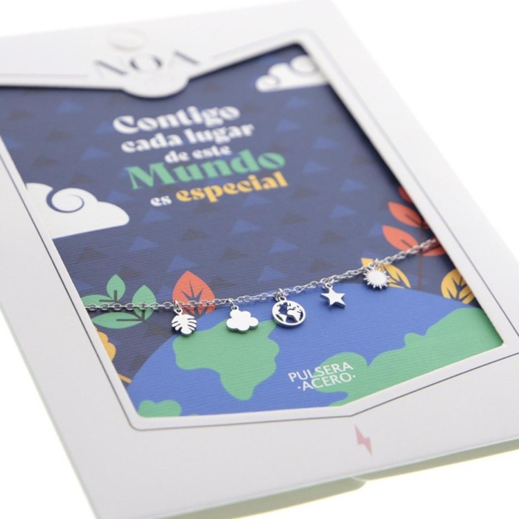Esta pulsera de acero plateado de la colección Noa Story está pensada para recordarte un mensaje muy especial: Contigo cada lugar de este mundo es especial. Su diseño combina un estilo actual con un punto sentimental, perfecto para regalar en cumpleaños, celebraciones o simplemente porque sí.