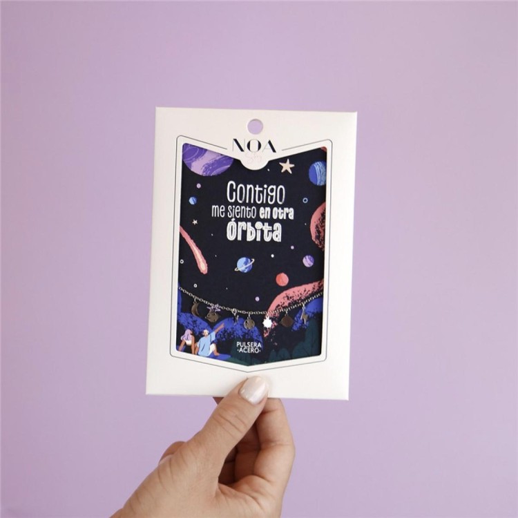 Esta pulsera de acero plateado de la colección Noa Story está pensada para recordarte un mensaje muy especial: Contigo me siento en otra órbita. Su diseño combina un estilo actual con un punto sentimental, perfecto para regalar en cumpleaños, celebraciones o simplemente porque sí.
