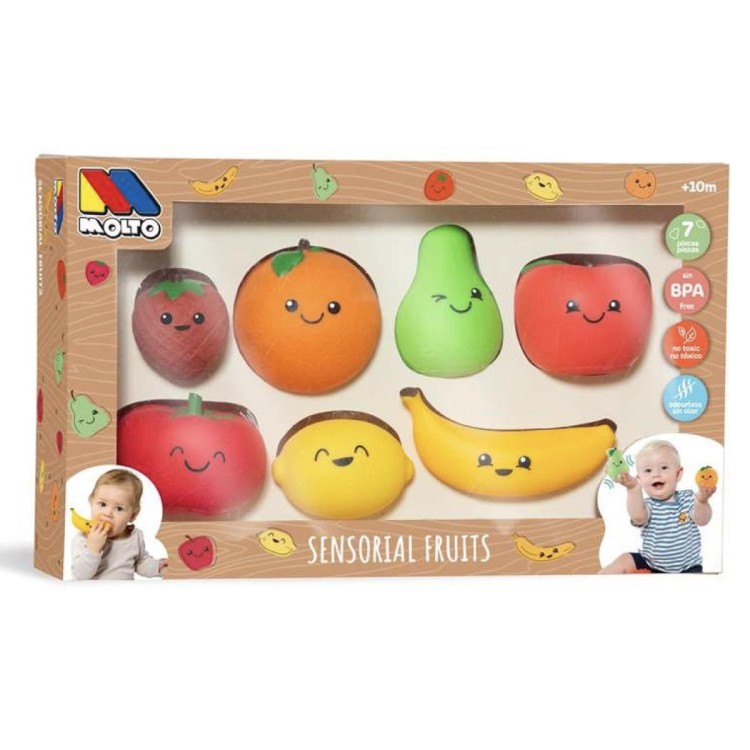 Este set de frutas sensoriales está pensado para las primeras exploraciones. Cada pieza presenta relieves y acabados blanditos que invitan a agarrar, apretar y morder, favoreciendo la motricidad fina y la estimulación táctil.
