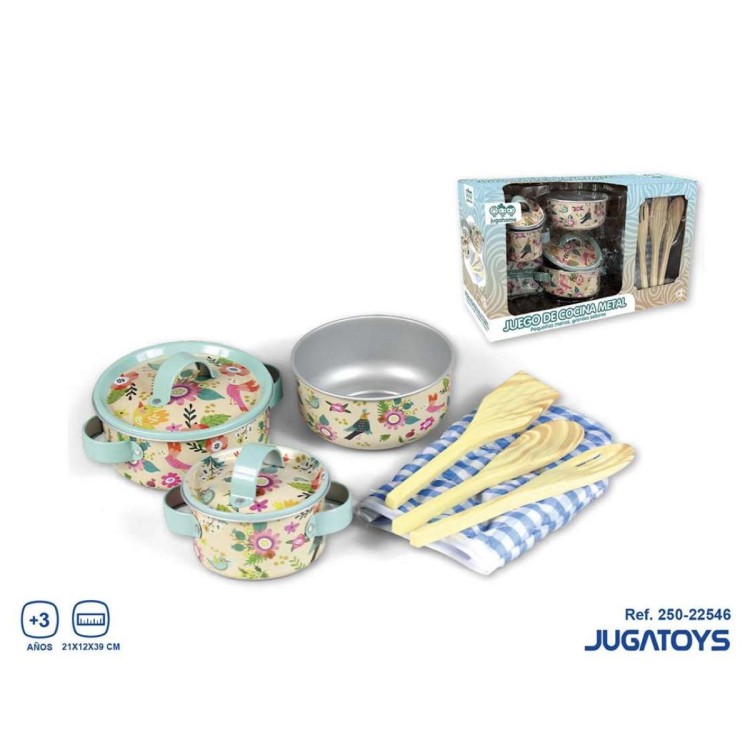 Set de menaje infantil con piezas de metal decoradas con flores: ollas con tapa y cazo, además de utensilios y paño. Perfecto para completar cocinitas y juegos de supermercado.